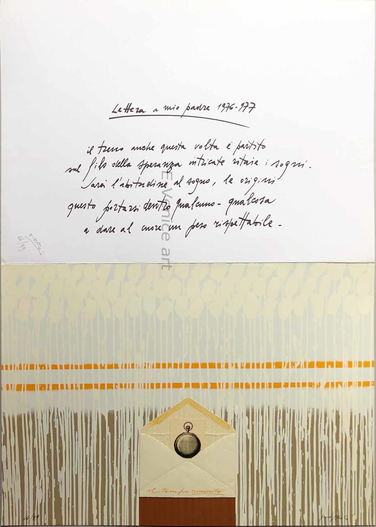 Il foglio ha una dimensione totale di 100 x 70 cm ed è piegato a metà. Nella seconda metà una poesia di Marcello Pirro