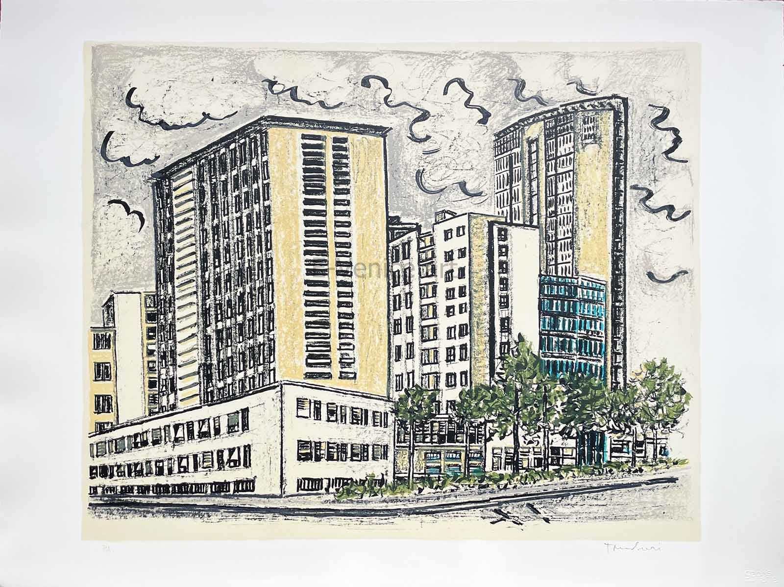 dalla cartella di 5 litografie CIAO MILANO", rif. Orfeo Tamburi Litografie 1944/1982, Catalogo ragionato delle litografie a cura di Giorgio e Guido Guastalla, Ed. Graphis Arte, 1991, Livorno, pag 127, pubblicata a tutta pagina.